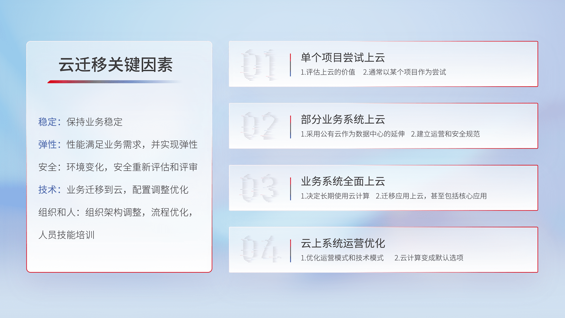 结合实际业务,,,,从规划设计、、、、云平台选型、、、、云原生改造、、、数据迁移、、、、集成交付,,,,迁移全过程为客户识别最佳上云路径,,做好风险识别管理,,,设计网络架构、、、、身份权限、、、、安全审计合规、、、、操作审计、、、日志审计、、、、监控告警策略、、多站点容灾设计等,,对云上基础设施进行整体规划,,,,提升IT治理水平,,以满足弹性、、高可用、、、、高性能的需求。。。