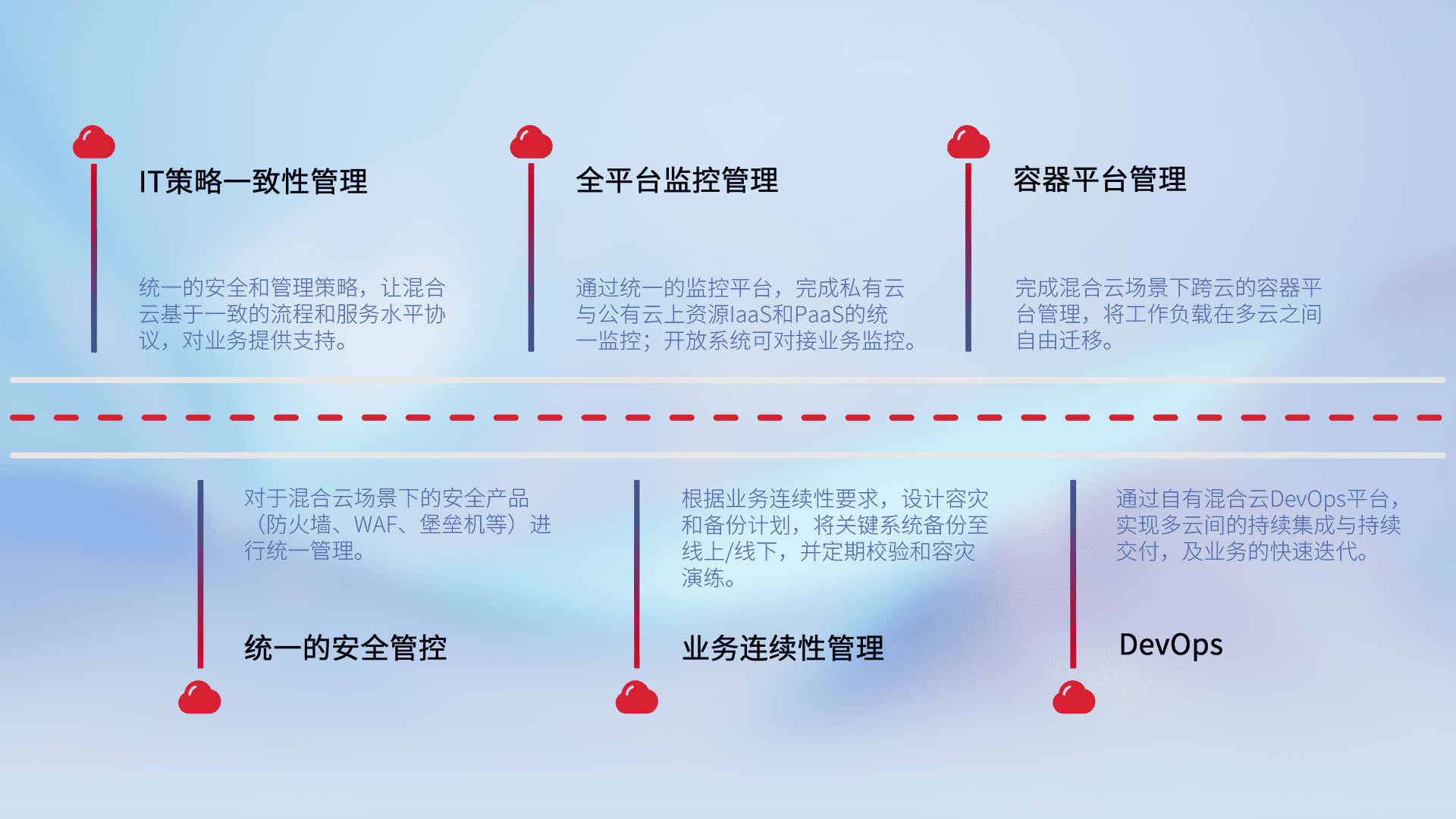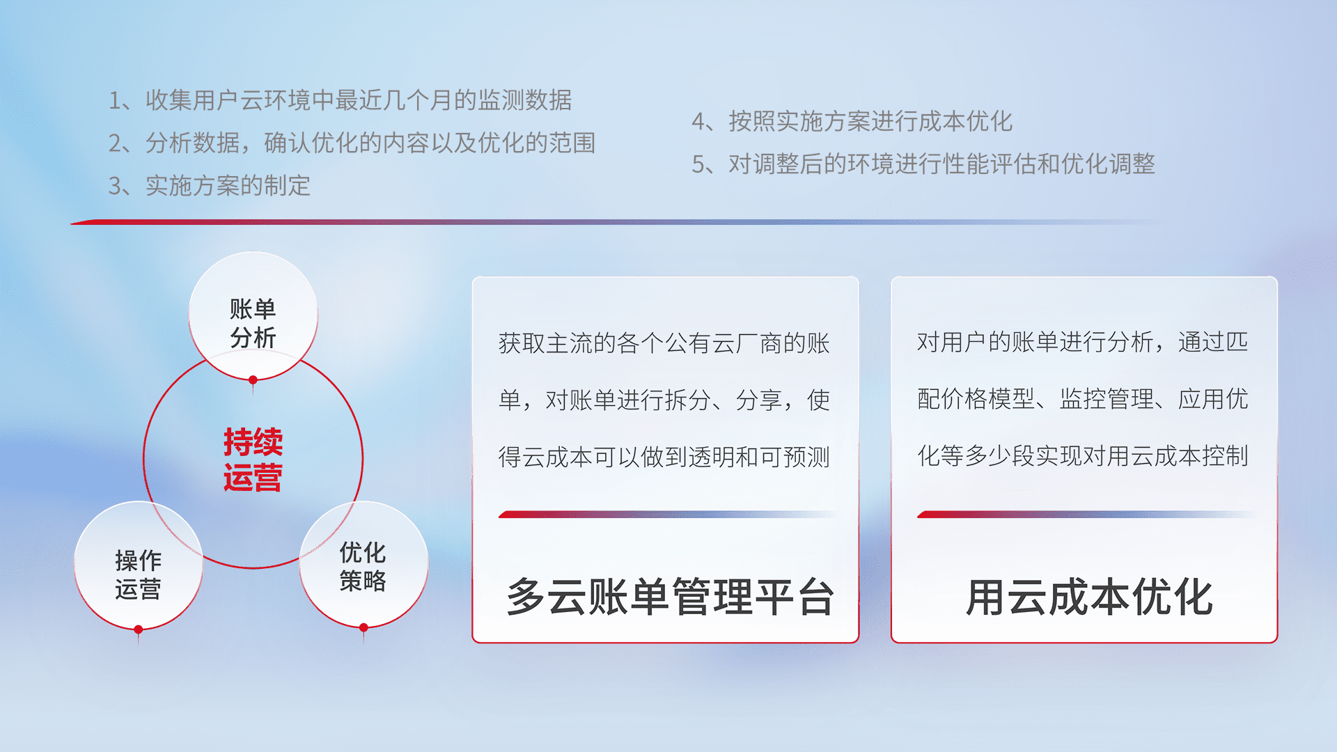 通过多云纳管,,以统一的资源数据模型把客户的云资源进行抽象和封装,,,进而实现对多云资源的统一操作,,,保障云资源管理的可靠性、、、稳定性与可用性。。。量身定制化运维内容,,,,配置、、、、开发运维、、、补丁管理、、、、备份、、、、监控、、、、认证和访问管理、、、审计和日常巡检等,,保障在用云过程中的可靠度,,,稳定度以及高可用率。。