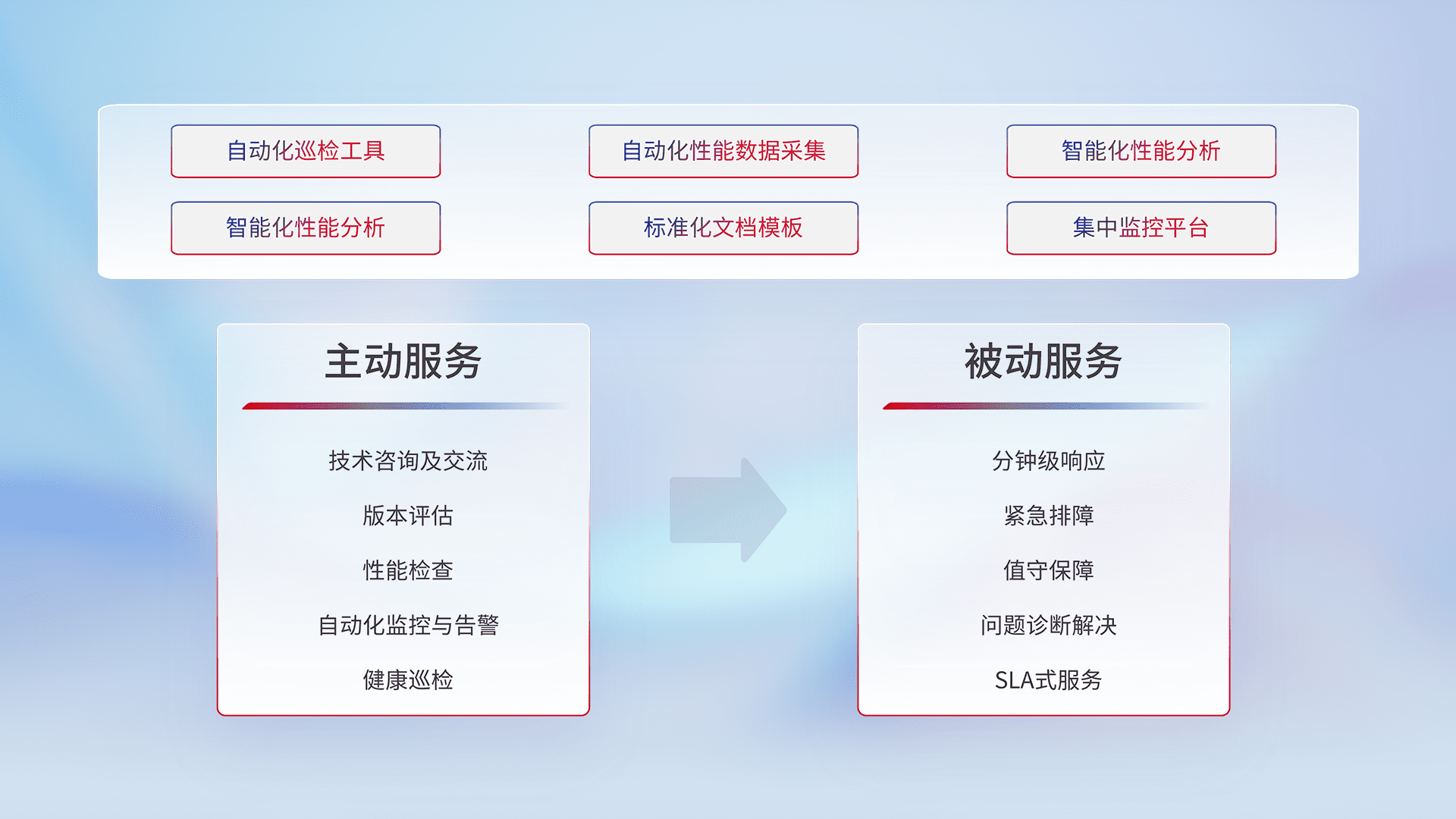 智能化工具和标准化文档,,保障服务质量,,,,提供主动服务(包含技术咨询、、、、版本评估、、、性能检查、、自动化监控与告警、、、、健康巡检)和被动服务包含(分钟级响应、、、、紧急排障、、值守保障、、问题诊断解决、、SLA服务)。。。
